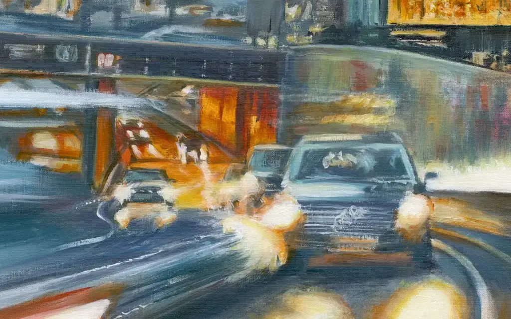 The Queensway tunnels and underpasses are among my favourite views. In addition, I often stand on footbridges to watch the streams of cars rushing below. These scenes, both chaotic and beautiful, consistently feature in many of my paintings.