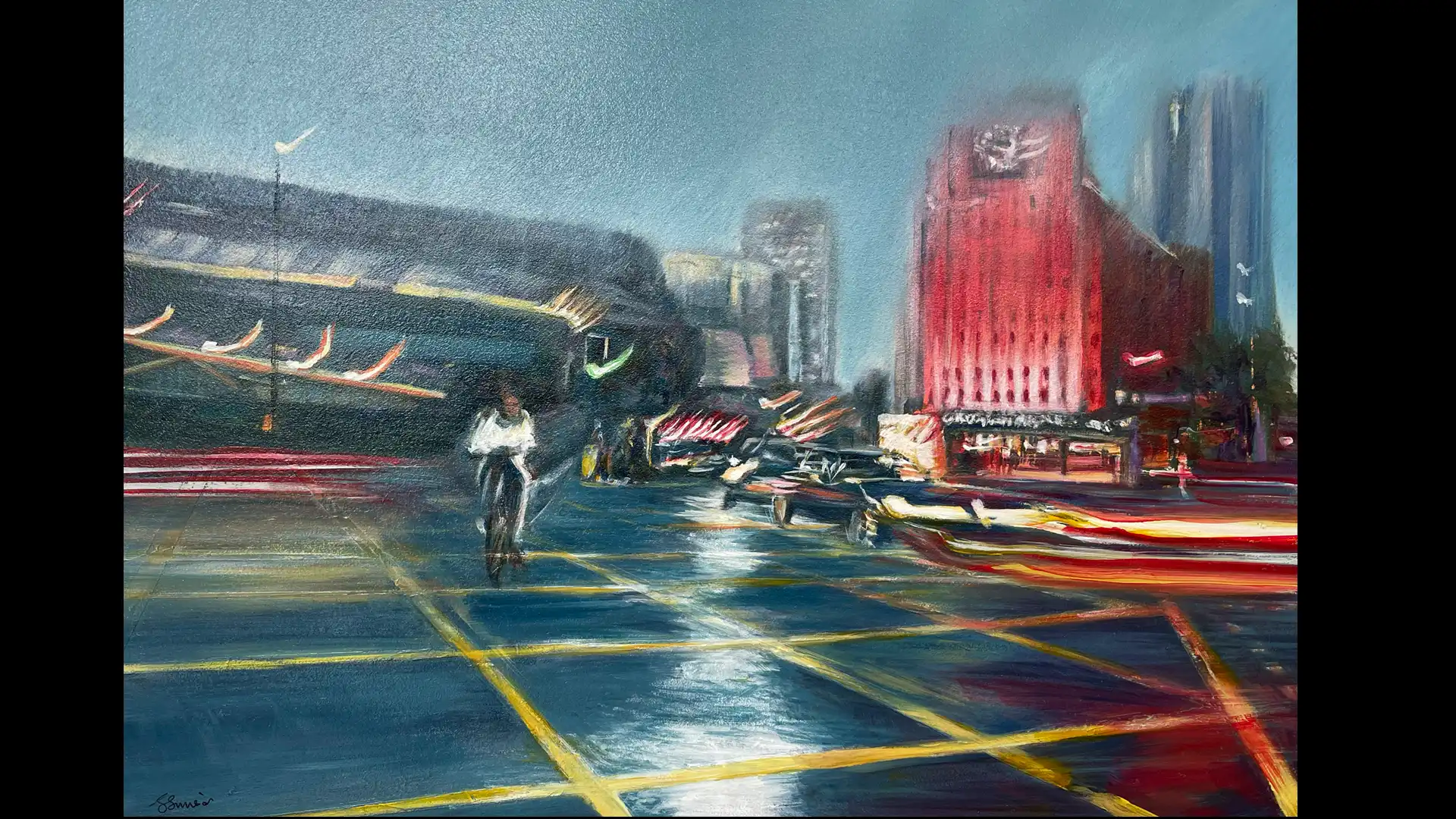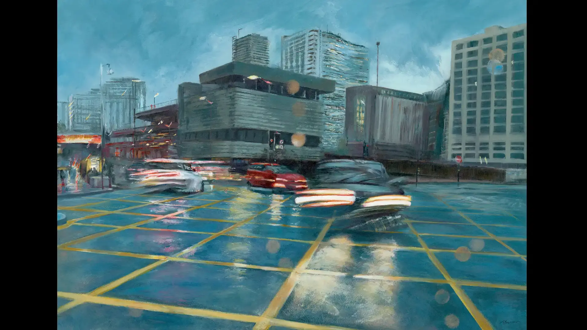 The rain gives me the reflections I am drawn to. Cars leave streaks of light, while buildings shimmer on wet pavements. Through painting, I try to hold on to the constant movement that makes Birmingham so vibrant.