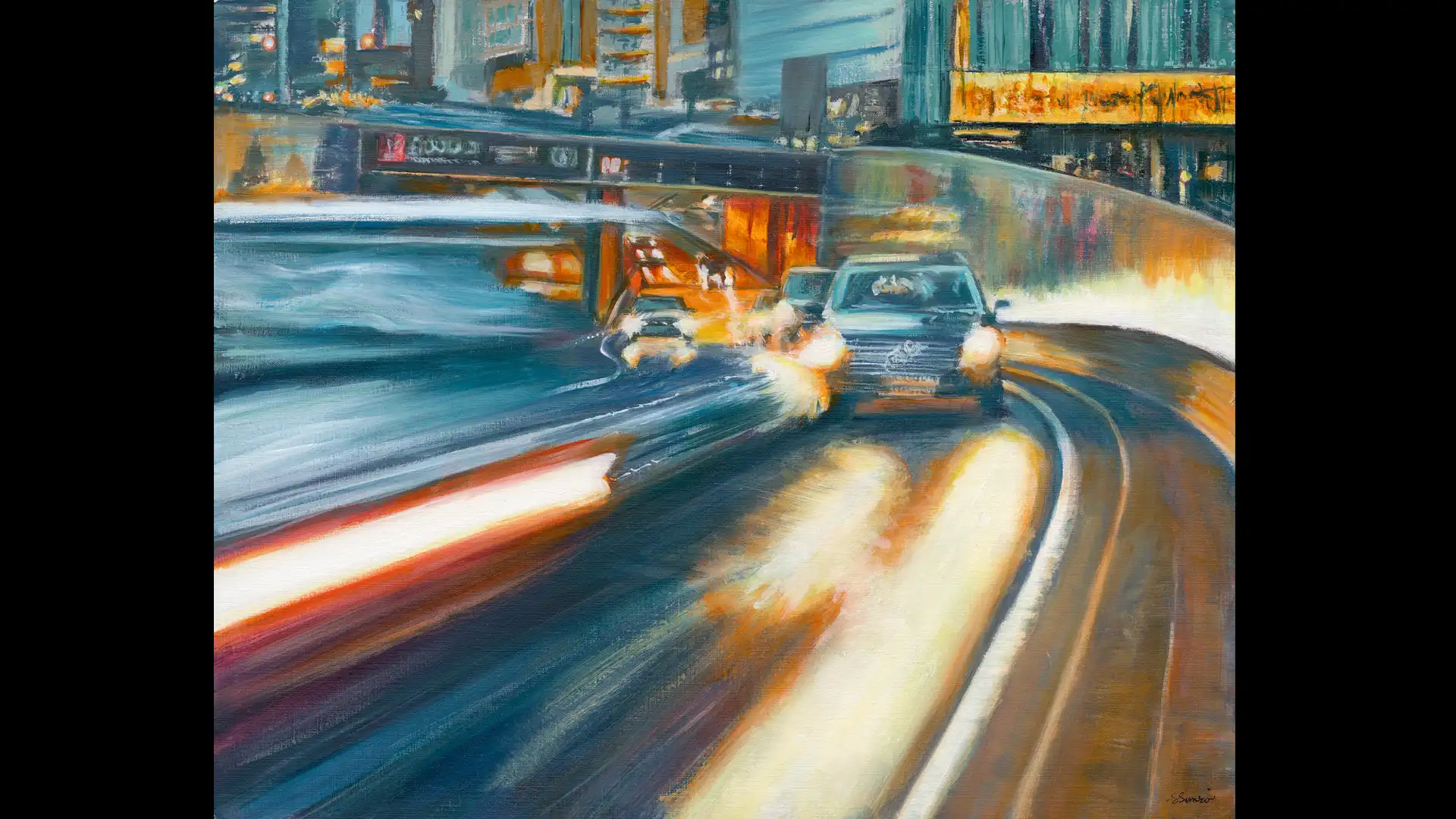 The Queensway tunnels and underpasses are among my favourite views. In addition, I often stand on footbridges to watch the streams of cars rushing below. These scenes, both chaotic and beautiful, consistently feature in many of my paintings.